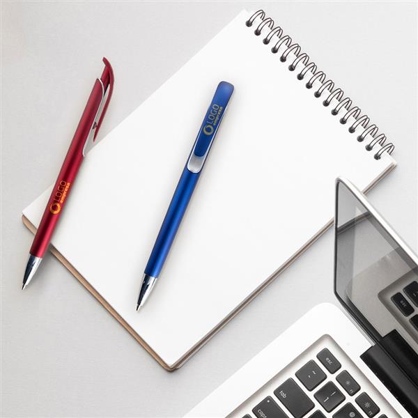 Caneta plástica com carga esferográfica azul e acionamento por clique. Tamanho total aproximado (CxL): 14,6 cm x 1,4 cm PERSONALIZADA